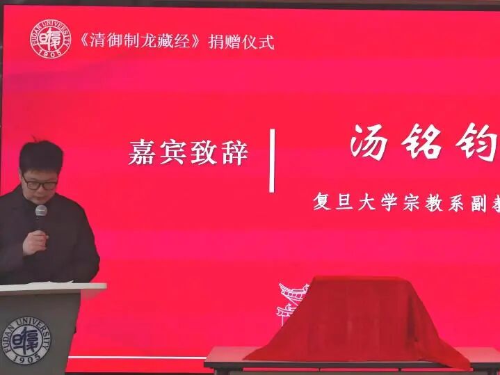 仪式上,陈志敏代表复旦大学向延藏先生和杭州国家版本馆表示感谢。他指出,这套《大藏经》的入藏,对复旦大学的古籍收藏、学术研究和文化传承都具有积极意义,这是复旦大学首次入藏木板刷印的大藏经,不仅为教学与科研提供了重要的实物资料;更为我们搭建了三个重要平台:一是学术研究平台,其丰富的版本价值与历史信息,将为清代宗教史、出版史、艺术史研究提供关键性史料;二是文化育人平台,通过原典展览、数字呈现、课程开发等形式,让青年学子在典籍中感受文化基因的传承;三是国际交流平台,作为中华文化的代表性符号,这部典籍将成为向世界讲述中国故事的重要媒介。